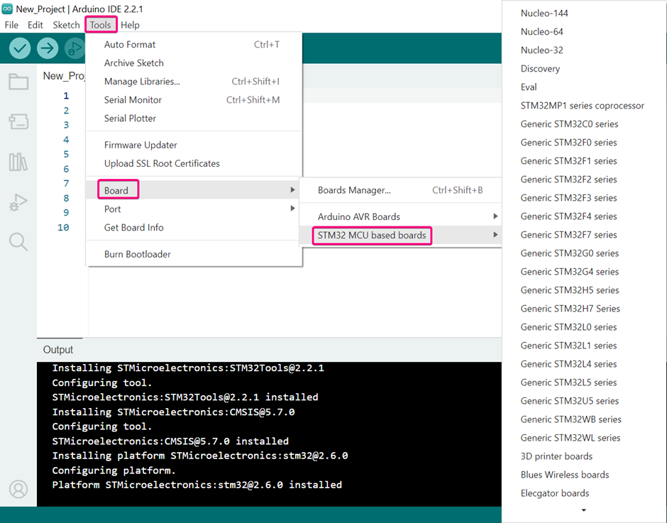 Arduino IDE sayesinde, yazılımın STM32 Nucleo, Discovery ve Evaluation kartlarımızı, 3D yazıcı kartlarımız ve kablosuz kartlarımızı tanıyabilmesini sağlayabiliyor!