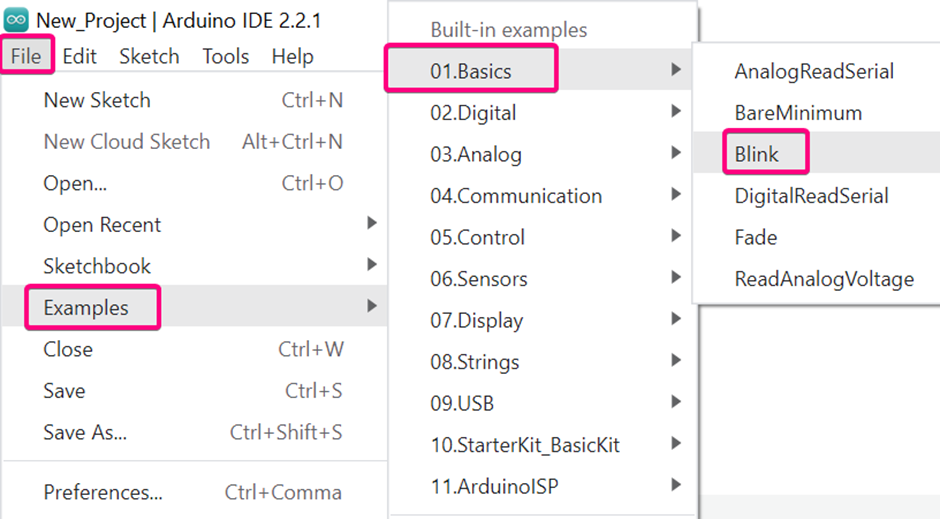 Yazılımı ve STM32 çekirdeklerini yükledikten sonra, Blink > Dosya > Örnekler > Temeller bölümüne gidin: