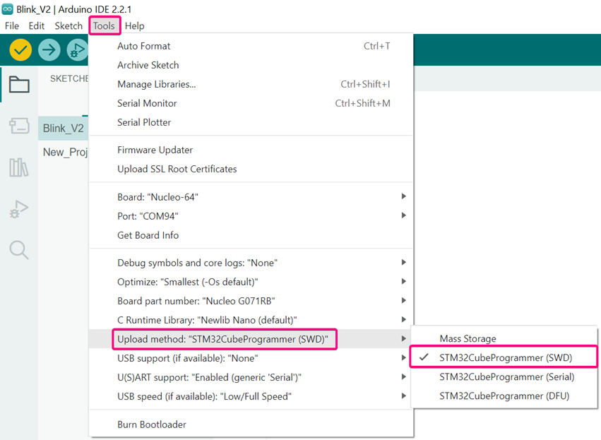 Arduino'nun IDE'sinde hata ayıklama oturumu başlatmak için Araçlar > Upload Method > "Serial Wire Debug" seçeneğine tıklayın, aşağıdaki gibi: