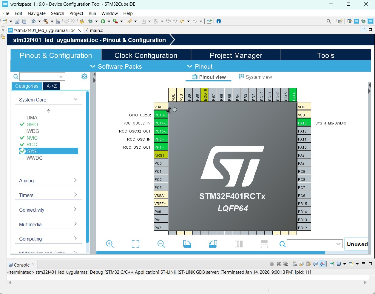 stm32f401_led_uygulamasi.ioc dosyasında Pinout & Configuration sekmesinden Pinout view kısmından kullanmak istediğimis pine tıklayarak GPIO_Output seçerek pini çıkış olarak ayarlıyoruz.Bu projede PC13'ü kullanıyorum.Çoğu Proje kartında bu pin bir led e bağlıdır.