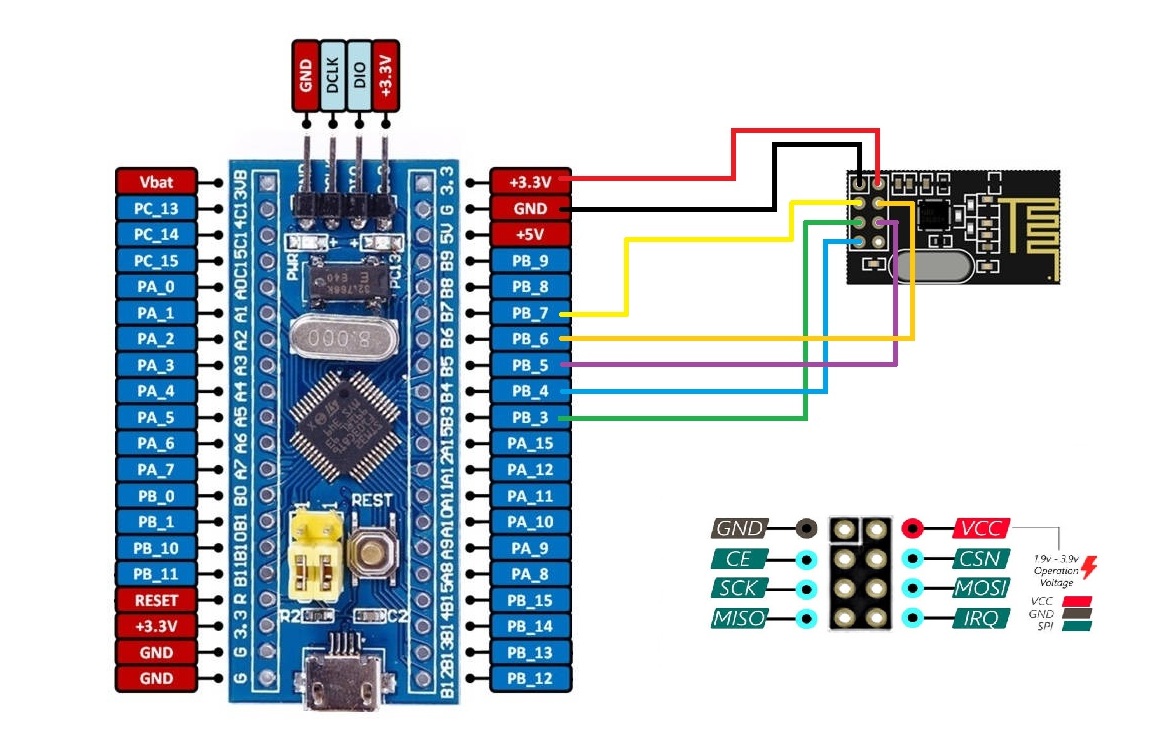 STM32F103C8 ile NRF24L01 arasında bağlantıyı ve başka bir NRF24L01 ile iletişim kuracağız.STM32F103C8 (Blue Pill) ve NRF24L01 modülleri arasındaki iletişim, genellikle SPI protokolü üzerinden yürütülür. Bu kurulumda dikkat edilmesi gereken en kritik nokta, NRF24L01'in 3.3V ile çalışmasıdır; 5V verilmesi modüle kalıcı zarar verebilir.