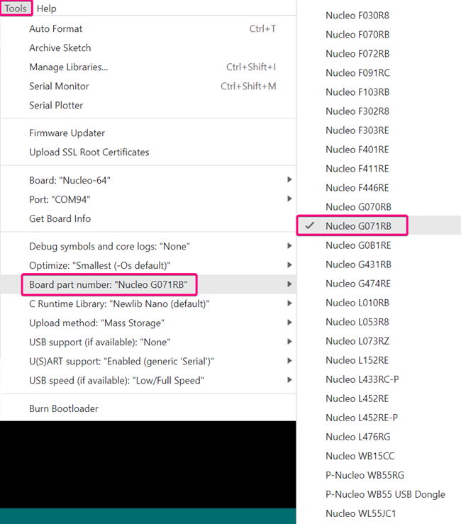 Daha önce yaptığımız gibi kart tipini seçtikten sonra, tekrar Araçlar > Board Part Number sayfasına tıklayın sayfasına tıklayın > kullanılan STM32 cihaz parça numarasını seçin: